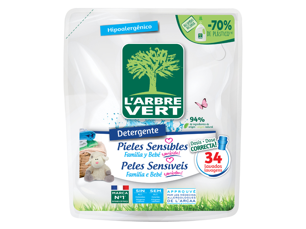 Detergente roupa máquina liquido l'arbre vert recarga peles sensiveis 34doses