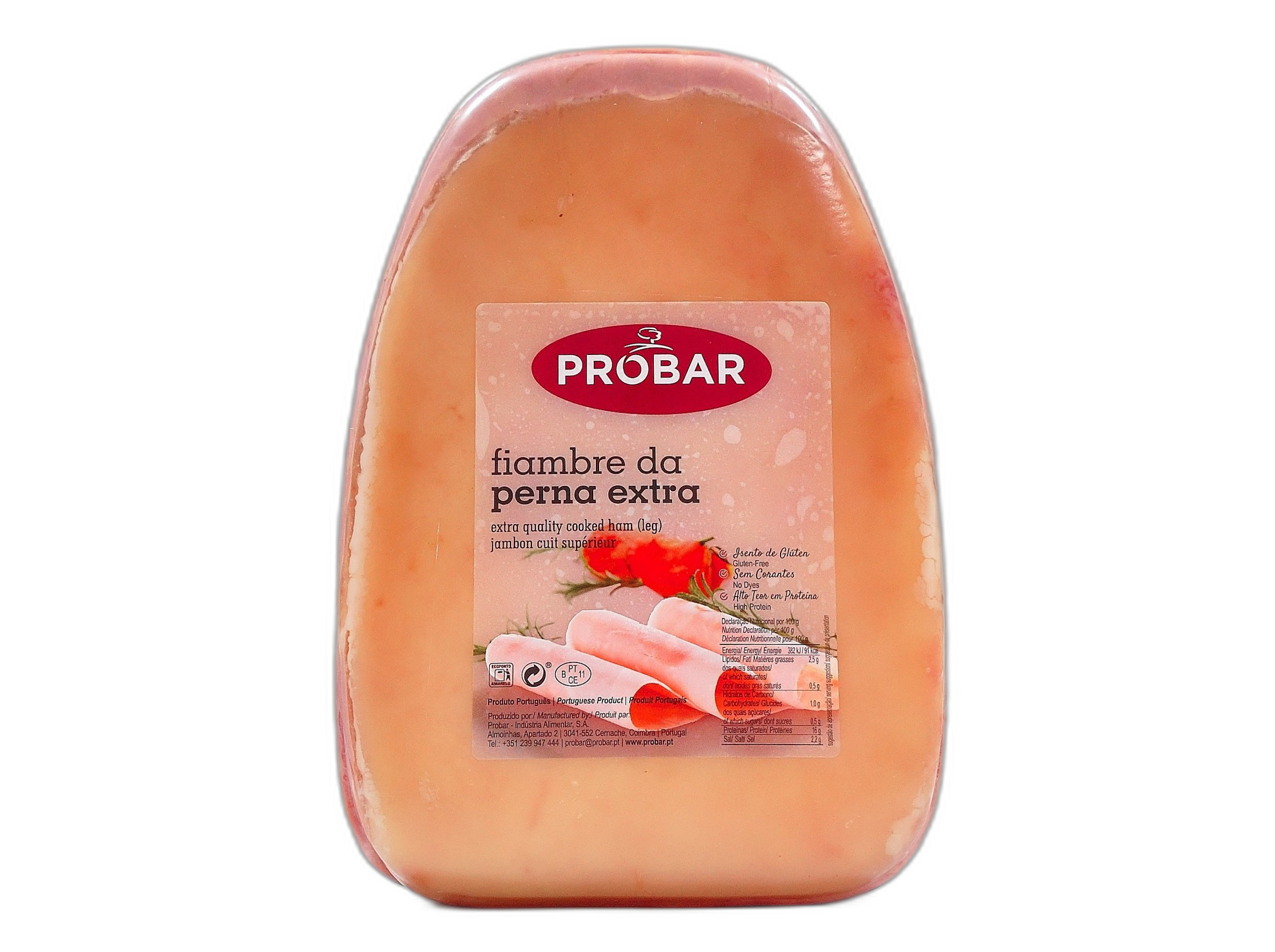 Ingredientes: perna de suíno (Origem: UE), sal, dextrose, conservantes (E250, E252), antioxidante (E301) e agente de revestimento (E472a). Pode conter vestígios de LEITE, SOJA e OVO.